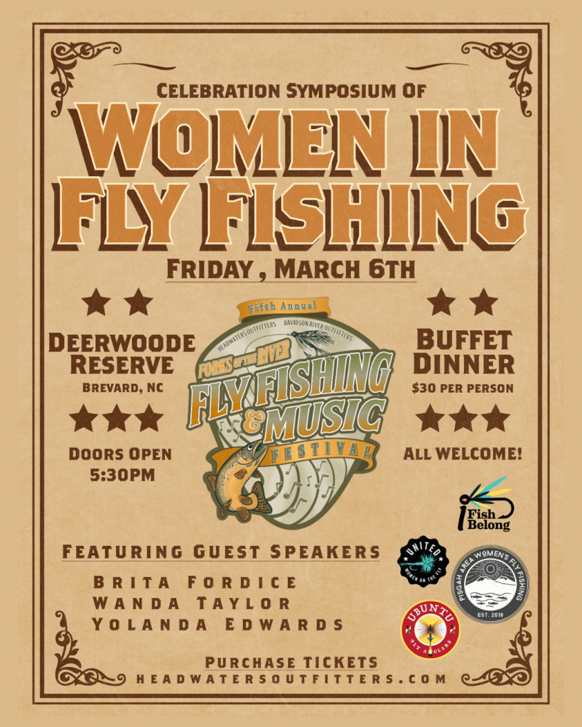 Enjoy a locally sourced buffet dinner while hearing from respected voices Brita Fordice, Wanda Taylor, and Yolanda Edwards, as they share their journeys, challenges, and visions through fly fishing.